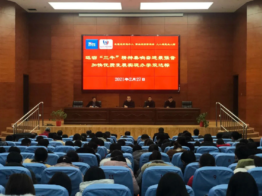2021年是辛丑牛年,要砥砺“三牛”精神,奏响奋进最强音。要做服务学生的孺子牛、创新教学的拓荒牛和艰苦奋斗的老黄牛,用实干精神推进学校各项工作再上新台阶。