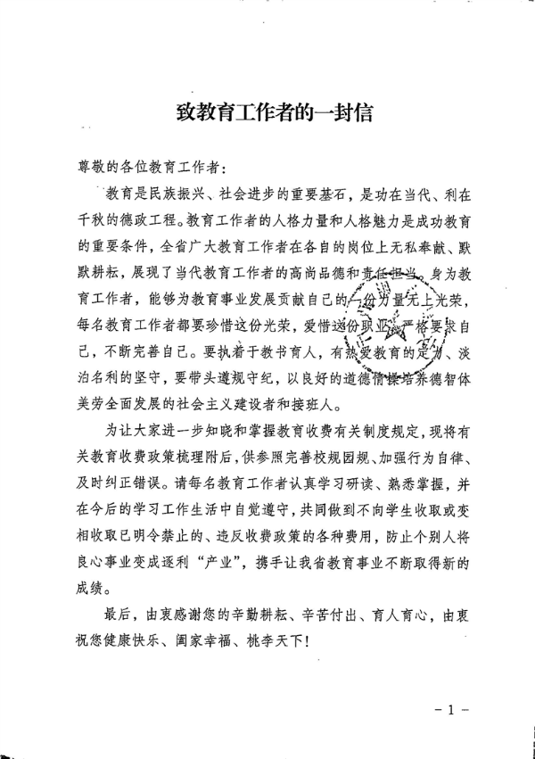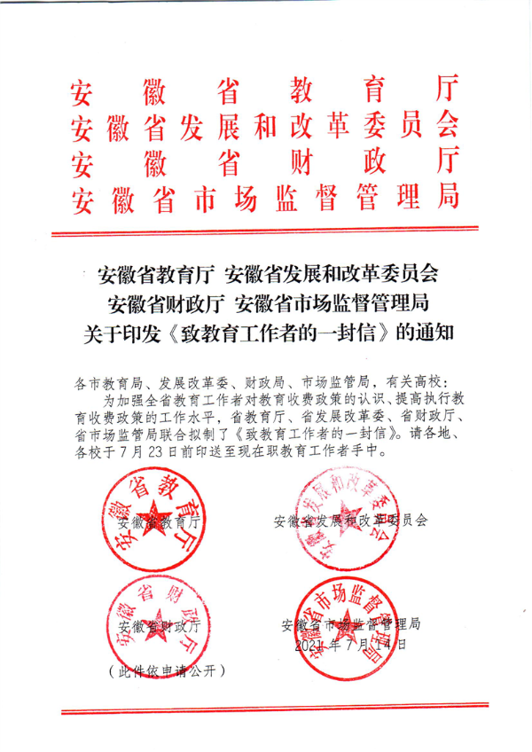 安徽省教育厅安徽省财政厅 安徽省市场监督管理局 关于印发《致教育工作者的一封信》的通知