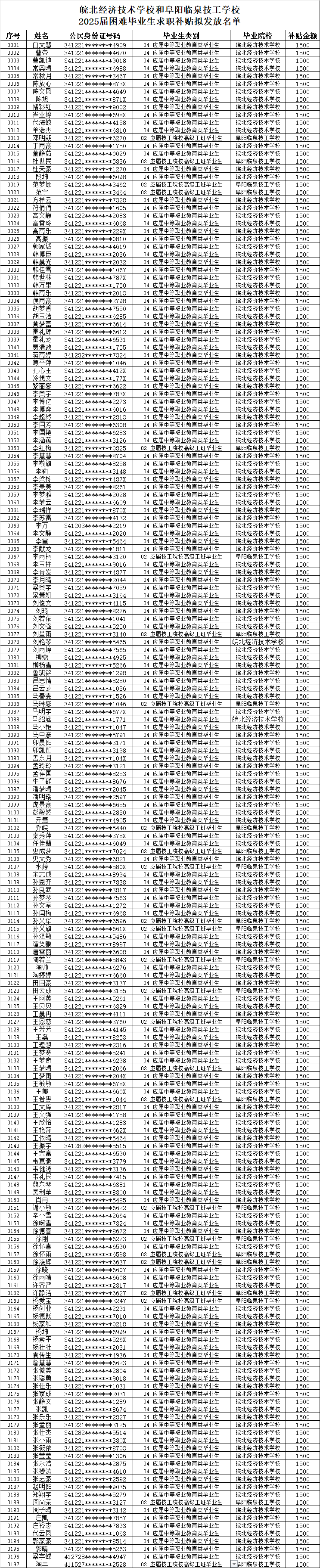 根据安徽省人力资源社会保障厅、安徽省教育厅、安徽省民政厅、安徽省财政厅、安徽省农业农村厅、安徽省残疾人联合会《关于做好2025届困难毕业生求职补贴信息化发放工作的通知》 (皖人社明电[2024]78号)文件精神,经系统申报和人工审核,确定白文慧等197名同学为我?!?025届毕业生求职补贴”人选。现将名单在全校范围内公示(详见附件)。公示时间:2024年12月1日至12月7日。